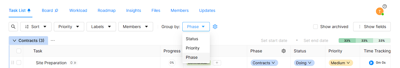 - First you should click Group by dropdown and select Phase.