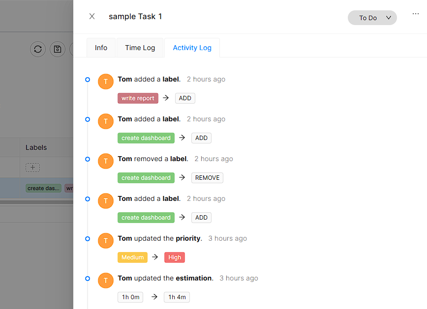 Then, it will open the Drawer with task adding and changing settings. In that drawer have three tabs and you should select the Activity Log tab. Then you will show all the activities did your selecting task.
