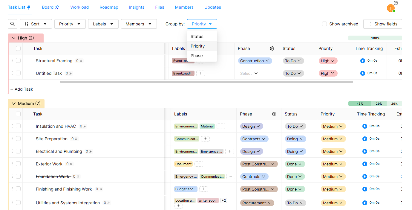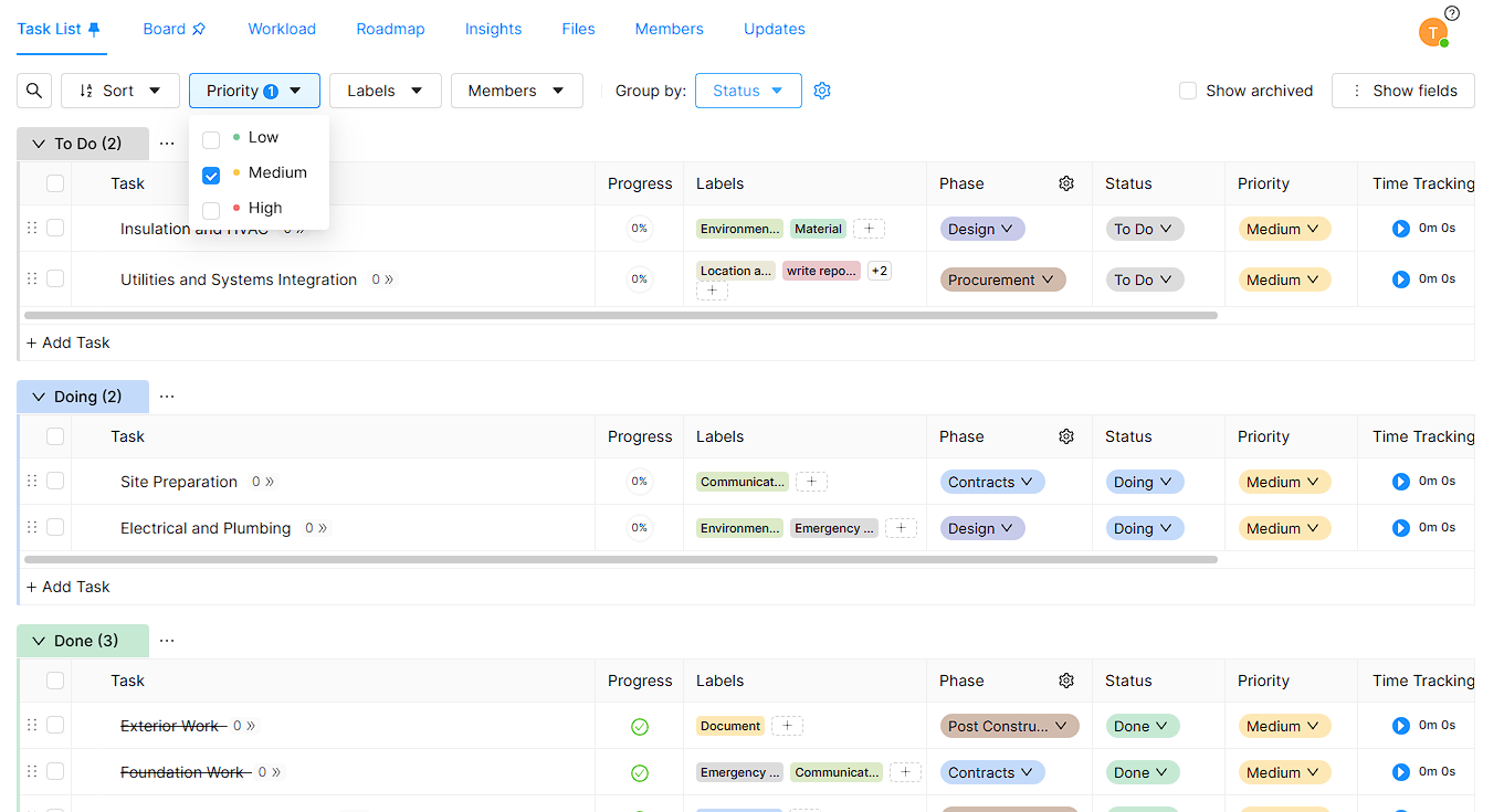 You can have group tasks list all tasks according to Status, Phase and Priority.