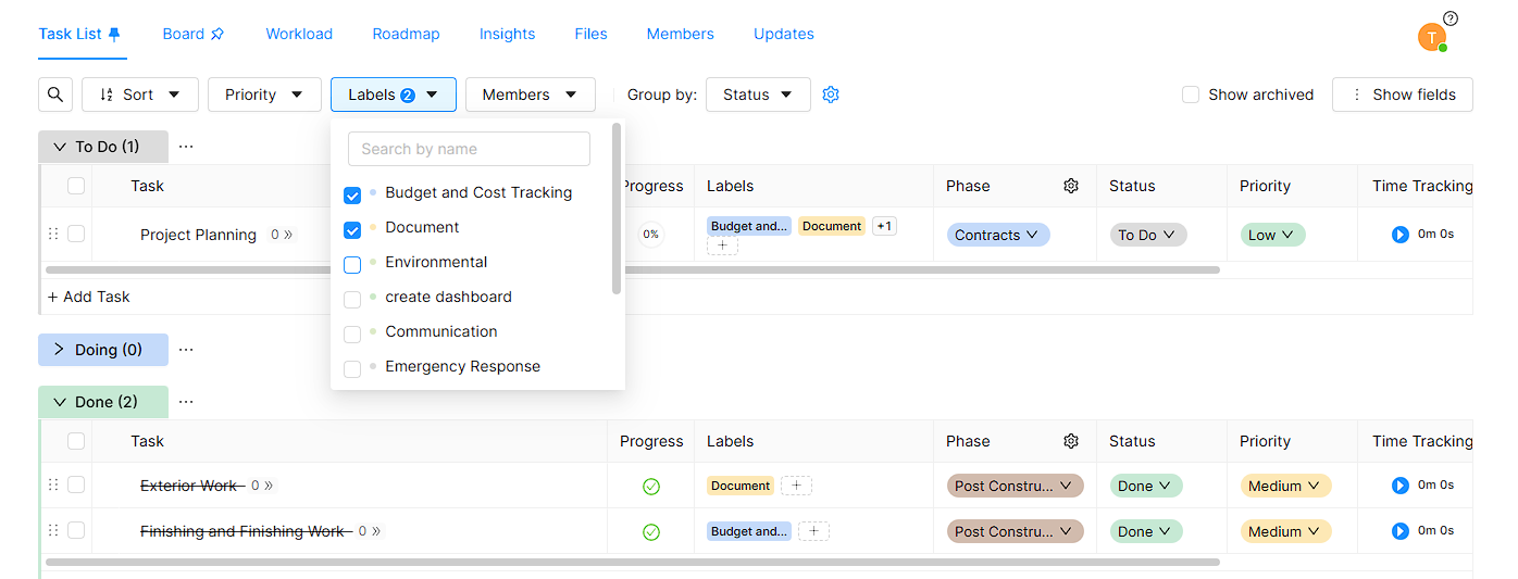 - Task list will automatically filter your task including selected labels.