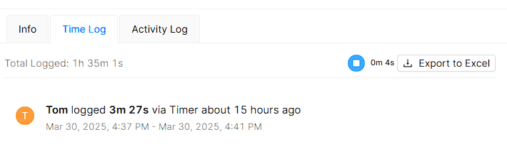 You can also log time for a particular task directly from the task list view. Click the Timer icon in the Time Tracking column, then click the Start Timer button to begin tracking. Click the Stop button to stop the timer. The logged time will also appear in the task drawer’s Time Log tab alongside entries recorded using the first method.