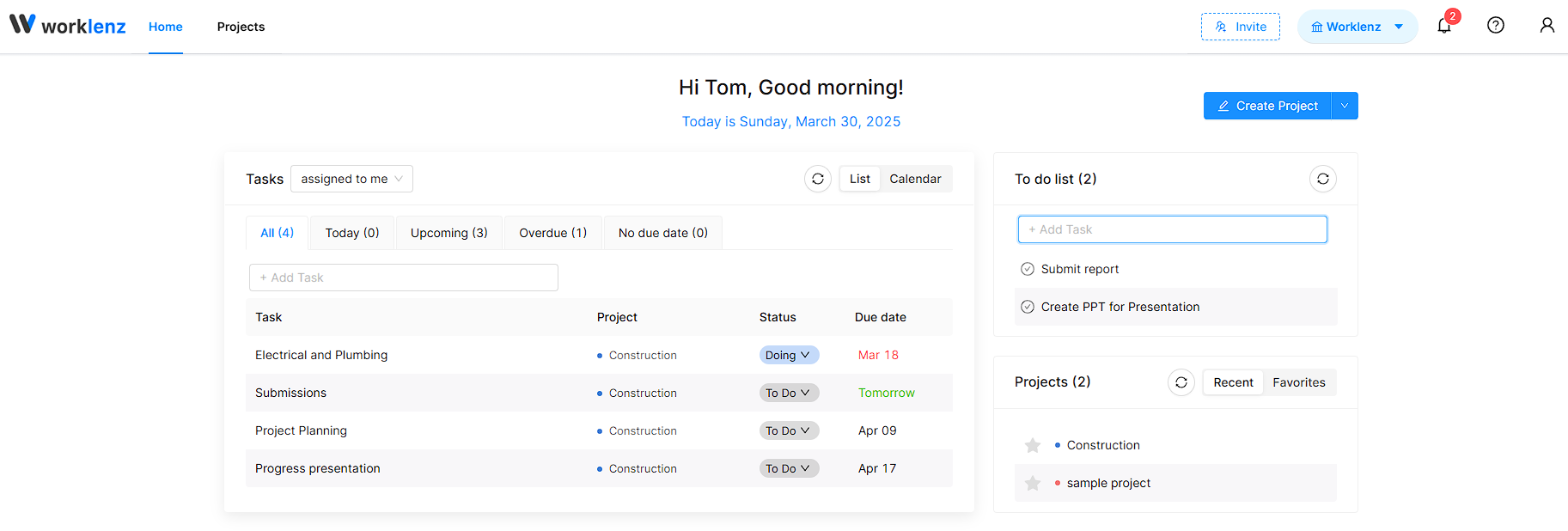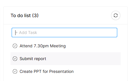 The Home Dashboard includes a simple to-do list for personal use. This is a standalone list that is not related to any project or other features in Worklenz.