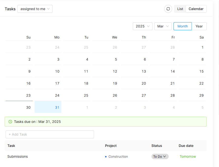 - Calendar View - Displays your tasks organized by date across the month. You can view detailed information about due tasks and upcoming tasks by clicking on any date. Use the date picker to navigate to any month or year.