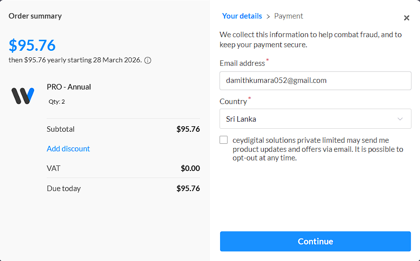 After selecting a plan, you will see your plan summary. Review the details and click Continue to proceed.